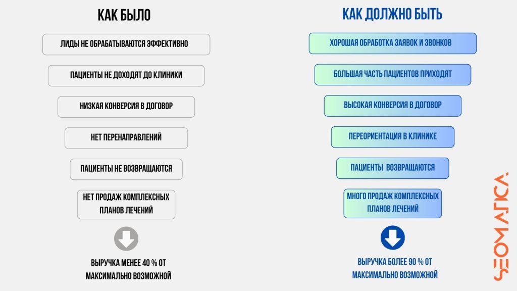 Воронка взаимодействия с пациентом была далеко не идеальной. Мы детально изучили каждый этап: от первого звонка до визита в клинику и обратной связи. Проблемы нашли быстро, как и решения. Например, переработали скрипты, оптимизировали процессы записи и усилили вовлеченность команды.