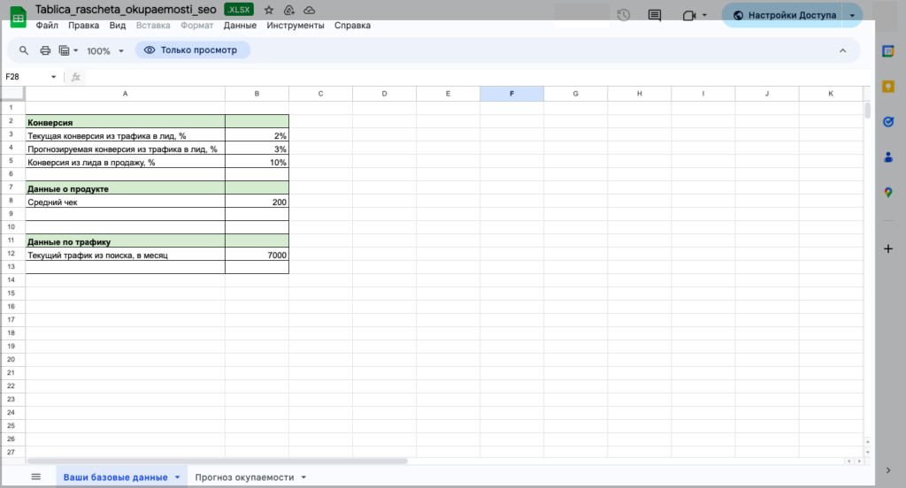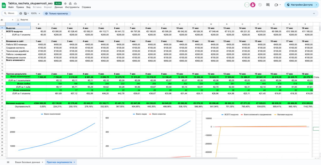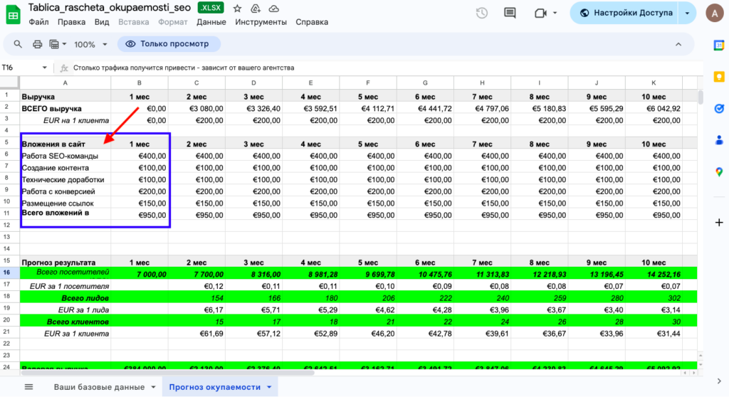 Когда вы заполните все, необходимые данные в листе «Ваши данные», можно приступить к расчёту окупаемости вложений в SEO.